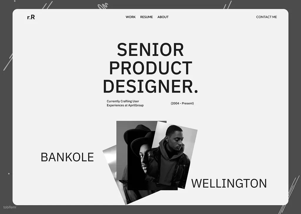 Minimal portfolio for designers and developers with projects grid and about/resume sections.